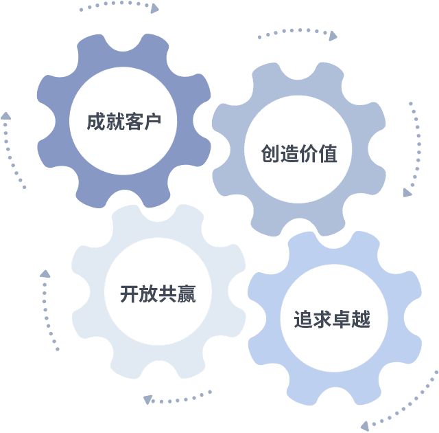 成就客户是一切决策的出发点,,创造价值是衡量所有工作的标准,,追求卓越是我们做事做人的态度,,开放共赢是我们的格局也是最终的结果。。价值观的齿轮环环相扣,,,推动着组织里的每个人不断向前。。